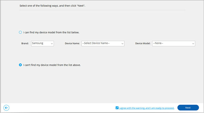 Step 1. From the device info screen, select "I can't find my device model from the list above".
