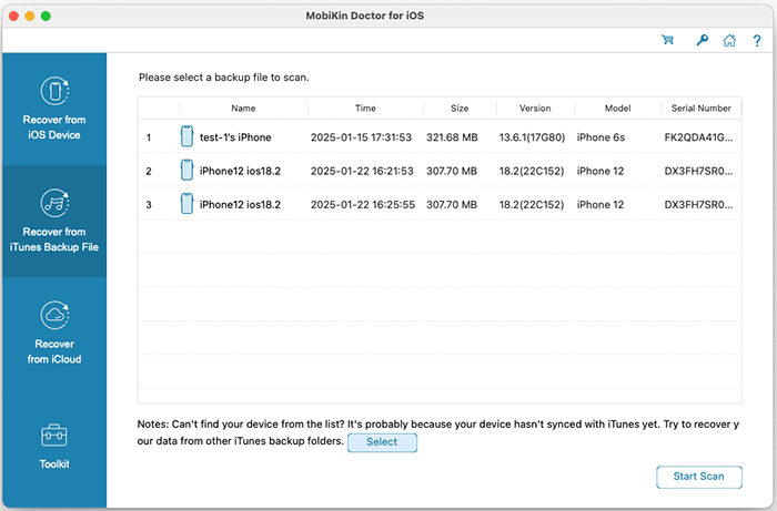 Note: If you cannot find the desired backup, click "Select" to locate an iTunes backup stored in another folder.
