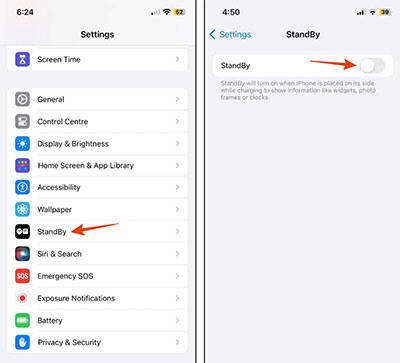 To do this: Open "Settings" and tap on "StandBy". Turn off the toggle for StandBy.