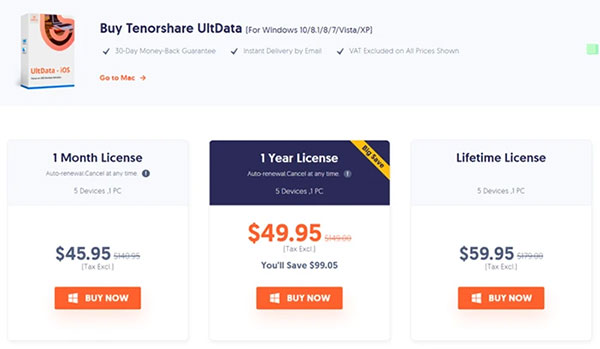 Tenorshare iPhone Data Recovery has three excellent plans to choose from: monthly subscription ($45.95 for Windows; $55.95 for Mac), annual subscription ($49.95 for Windows; $59.95 for Mac), and lifetime subscription ($59.95 for Windows; $69.95 for Mac). Please choose the option that suits you and proceed with your online purchase.