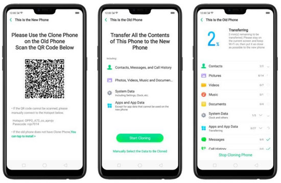 Clone Phone, the OPPO official phone switching tool, uses a QR code to create a connection between the sender and recipient. This app supports transferring data like contacts, text messages, call logs, media files, app data, etc. This app helps perform data transfer from Android/iPhone to OPPO/Realme.