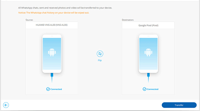 Step 3. Click "Transfer" to start the WhatsApp transfer from Samsung to Samsung. You can keep your eyes on the progress bar for more about the procedure.